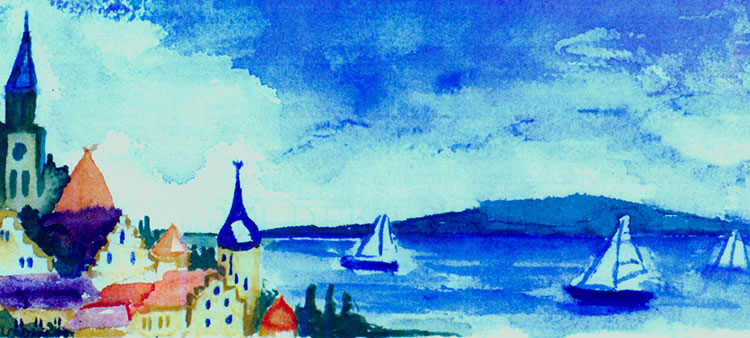 Die Farben des Wassers, spiegeln die Farben des Himmels und der Erde. Ich liebe die Farbe Blau, abgetönt über Grün bis Gelb. Die Spiegelungen der Sonne über Violett bis Rot, die Helligkeit des Mondes auf dem dunklen See und die vielfältigen Reflektionen der Bäume, Häuser, Boote oder Vögel., All dies bildet das Wasser gleichmütig ab und behält doch immer seine Unabhängigkeit. So bin ich fasziniert von der Farbenpracht die mich umgibt. Sei dies in der Natur oder in der Kleidung.